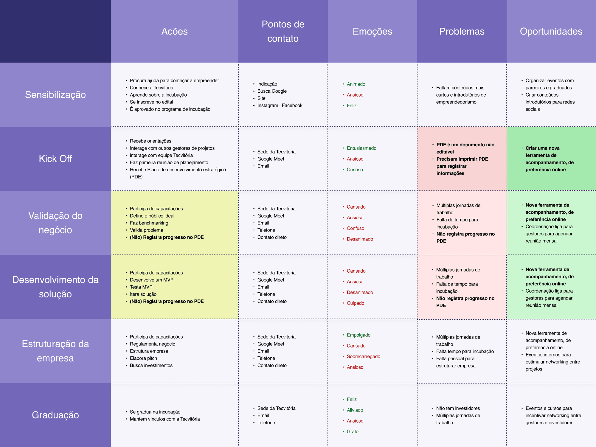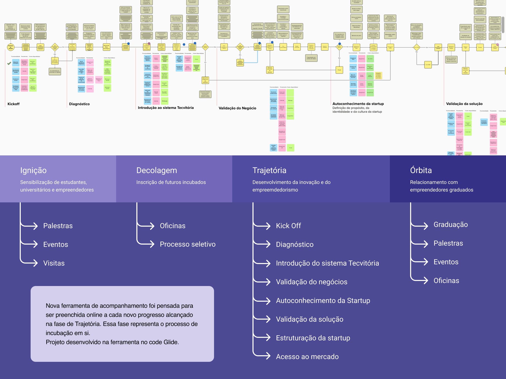 Por questões de agenda, precisei sair do projeto antes da criação da nova ferramenta estratégica no Glide. Em 2023, a Tecvitória passou por um rebranding, que incluiu sua identidade visual, a nova trilha de incubação e a oferta de novos serviços e parcerias. Infelizmente, desconheço os impactos da nova trilha de incubação aos novos gestores.
